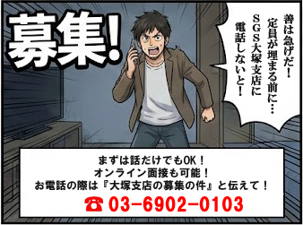 今なら仕事と住まいが同時に手に入る! ※定員枠が無くなる前に、今すぐお電話ください 『SGS大塚支店の募集の件』と言ってください まずは話を聞きたいと言う方はオンライン(ZOOM、スカイプ、その他)面接も可能です