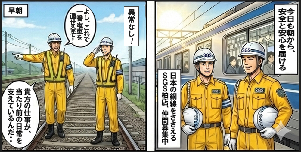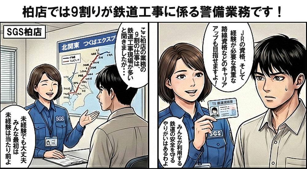特にエリア的には上野から取手までの常磐線やつくばエクスプレス線 鉄道工事における警備業務は、一般的な交通誘導業務のほか、 ■□■□■□■□■□■□■□■□■□■□■ 尚且つ、つくばエクスプレス列車見張り員はそのJR東日本の資格を 又、資格取得後、未経験者の方には、ベテランの先輩が 資格取得者は当然ながらその特異性により手当も支給されます。 ■□■□■□■□■□■□■□■□■□■□■ 柏店でこのような警備業務を経験すると、一般の人では知り得ない 是非、柏店で同じ仲間となって、我が国の主要な交通機関である 柏店の特徴は下記の通り。 ① 日勤は、 9:00スタートの現場が多数あります 警備員未経験の方、大歓迎です。現場に入って、 私たちはわかっています。みんな最初は未経験なのを! 同じ会社の仲間や元請・施工会社の方と共に頑張れる方、 柏店では、随時警備員を募集しています。