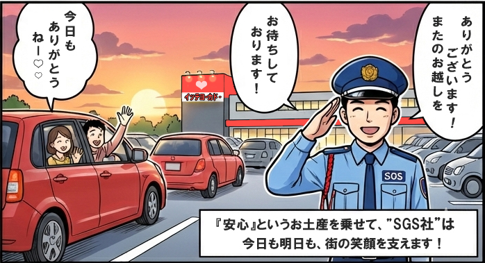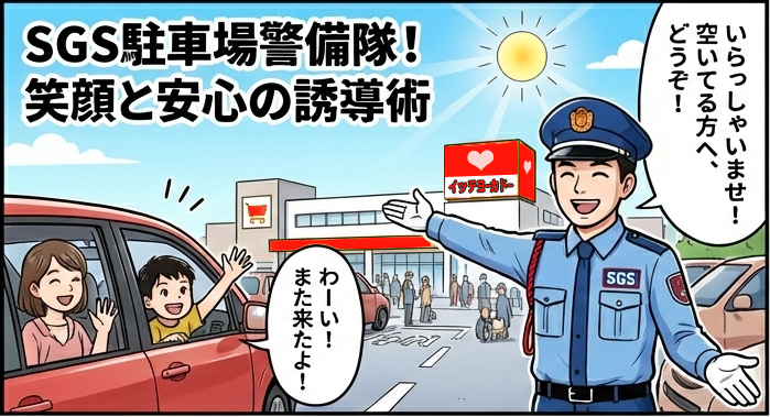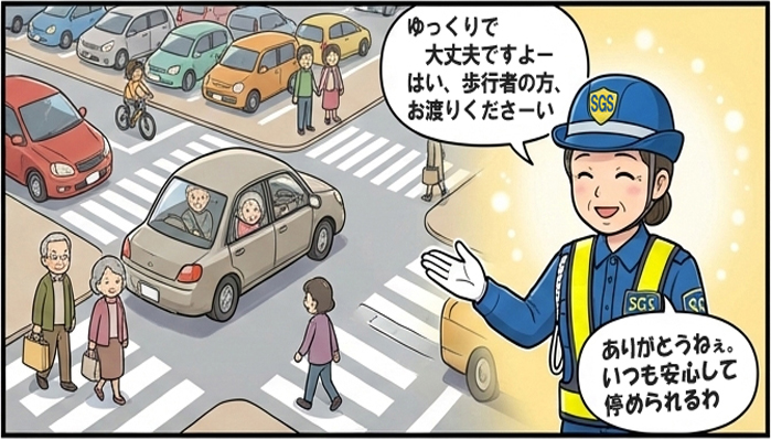 駐車場警備は、車道と駐車場(警備対象施設)との境界から駐車場内の車両、歩行者の安全を確保するために、適切な誘導及び案内をして、入退場時の混雑、事故の防止と駐車効率を図ることを目的としています。
